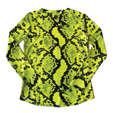 The Wild Rose Neon Snakeskin print top is made of the highest-rated sun protective material, blocking both UVA and UVB rays; it's your shield against harmful sun rays.