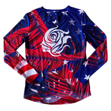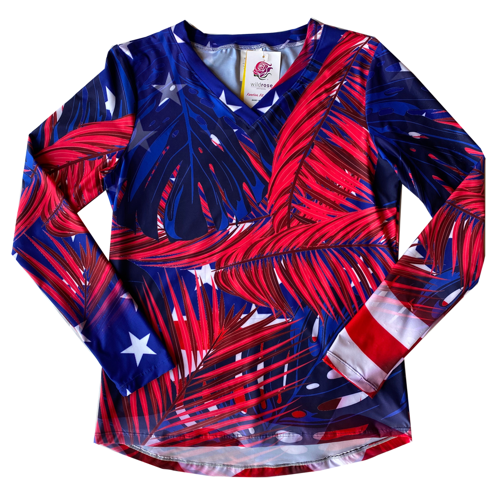 The Wild Rose Patriotic Palm long sleeve shirt is made of a lightweight UPF50+ poly lycra blend. Smooth and cool to the touch, this stretchy semi-relaxed fitting shirt is comfortable and stylish. Wear it as sun-protective summer wear or as a base layer in the cold winter months. By combining functional performance material with this trendy print, this shirt will transition with you throughout the day, no matter what adventure awaits!