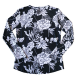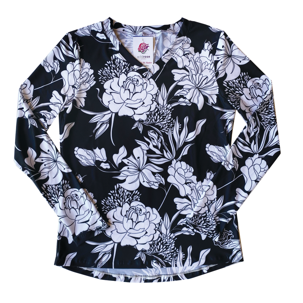 The Wild Rose Vintage Rose long sleeve shirt is made of a lightweight UPF50+ poly lycra blend. Smooth and cool to the touch, this stretchy semi-relaxed fitting black and white floral shirt is comfortable and stylish. Wear as sun-protective summer wear or as a base layer in the cold winter months. By combining functional performance material with this trendy print, this shirt will transition with you throughout the day, no matter what adventure awaits!