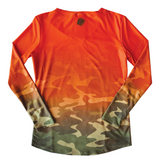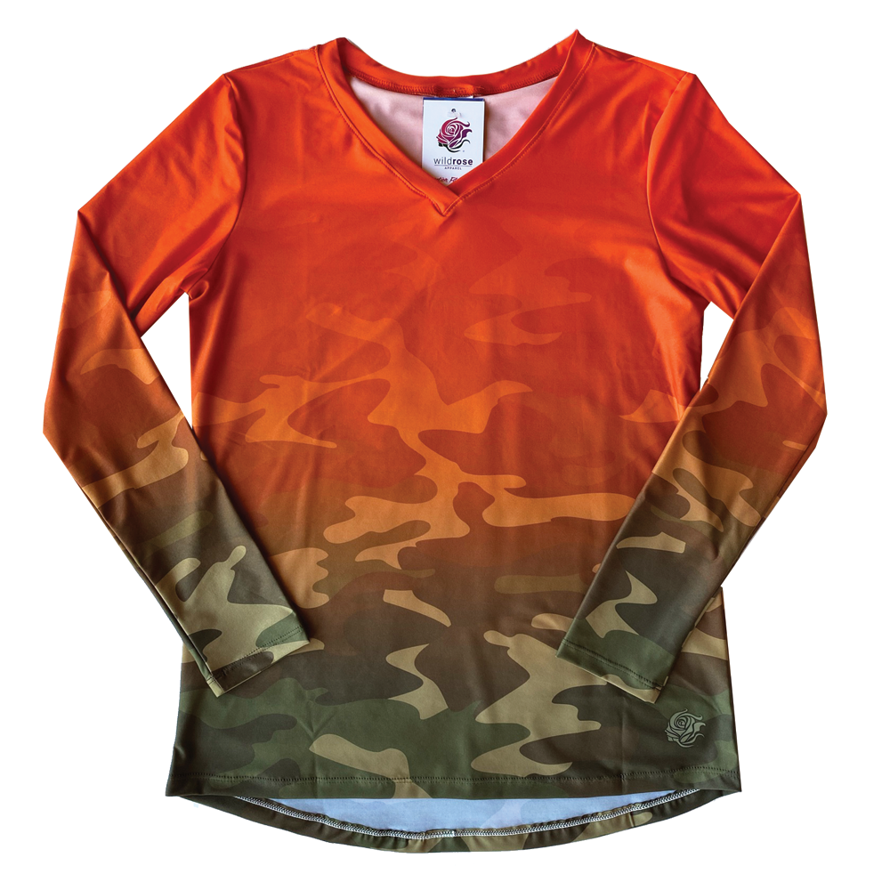 Embrace your wild style in the Orange Army Camo long sleeve shirt! Made of a lightweight UPF50+ poly lycra blend, this shirt is cool to the touch and drys quickly, making it perfect for active women. The soft stretchy material combined with a feminine cut, make this shirt comfortable and stylish. Wear as the ideal women’s fishing shirt, sun-protective Summer wear, or as a base layer in the cold winter months. By combining functional performance material with the fashionable Wild Army print, this shirt will transition with you throughout the day no matter what adventure awaits!