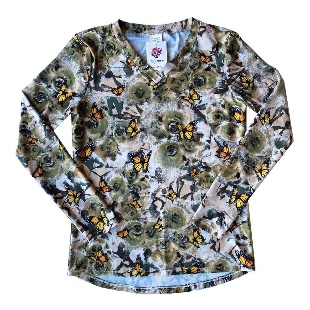The Wild Rose Camo® Butterfly long sleeve shirt is made of a lightweight UPF50+ poly lycra blend. Smooth and cool to the touch, this stretchy relaxed-fitting shirt is comfortable and stylish. Wear this UPF50+ camo butterfly V-neck shirt as the ideal women’s fishing shirt, sun-protective summer wear, or base layer in the cold winter. By combining functional performance material with our fashionable Wild Rose Camo®, this shirt will transition with you throughout the day no matter what adventure awaits!