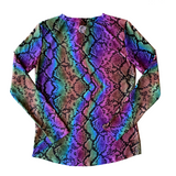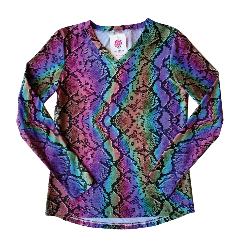 The Wild Rose Snakeskin long-sleeve top is made of a lightweight UPF50+ poly lycra blend. Smooth and cool to the touch, this stretchy semi-relaxed fitting shirt is comfortable and stylish. Wear it as sun-protective summer wear or as a base layer in the cold winter. By combining functional performance material with this trendy print, this shirt will transition with you throughout the day, no matter what adventure awaits!