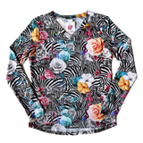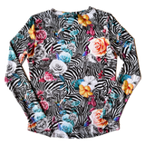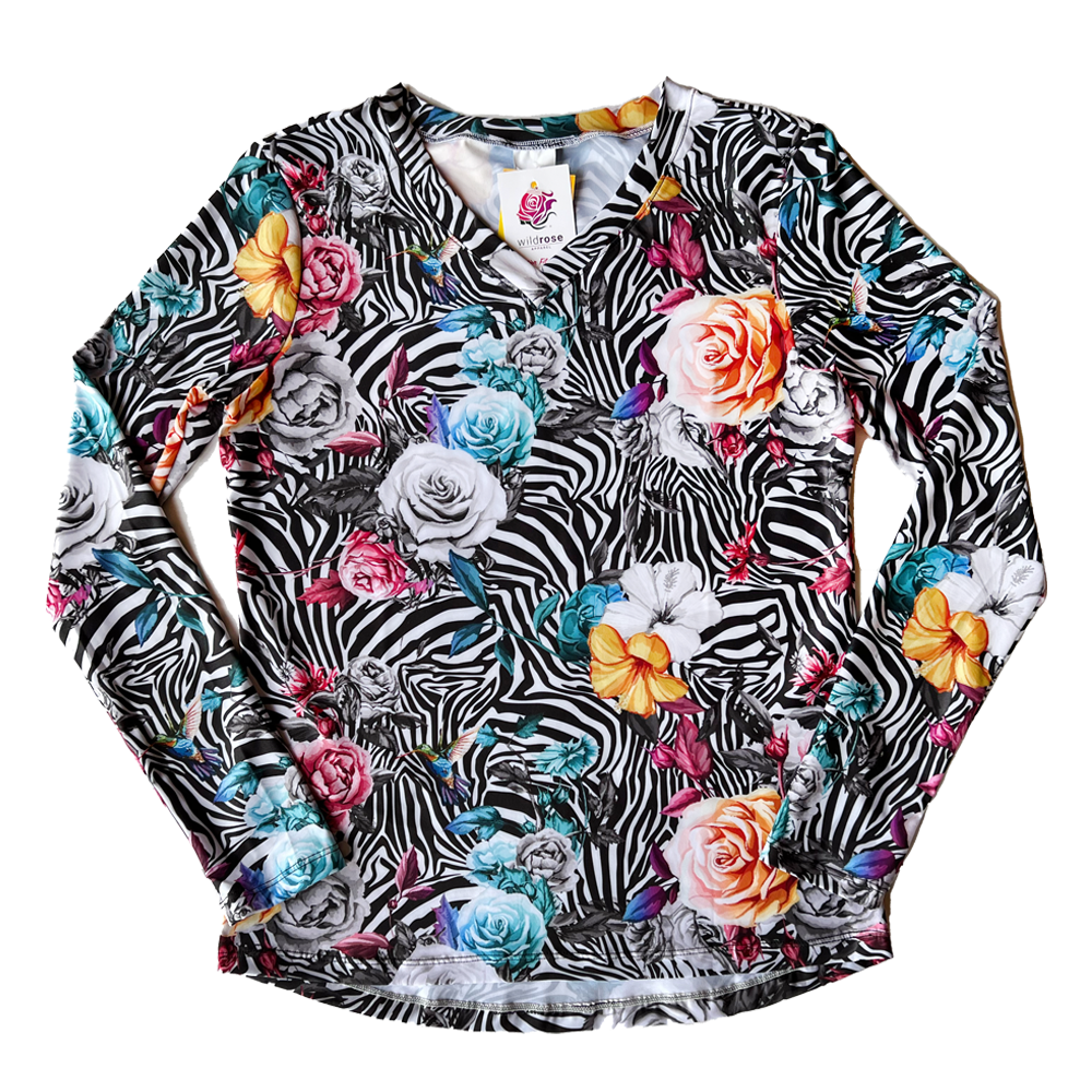 The Wild Rose zebra long-sleeve shirt is made of a lightweight UPF50+ poly lycra blend. Smooth and cool to the touch, this stretchy semi-relaxed fitting shirt is comfortable and stylish. Wear this spring roses and zebra long sleeve as sun-protective summer wear or as a base layer in the cold winter months. By combining functional performance material with this trendy print, this shirt will transition with you throughout the day no matter what adventure awaits!